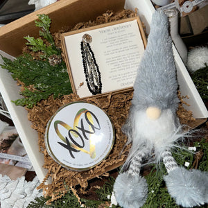 This gift box includes a "Your Journey” beaded bracelet, an XOXO ‘soap in a sponge’, a shimmer winter gnome and a sprig of frosted fir. A sweet gift for a friend, mother, daughter, grandma.. or any special lady who could use a smile!