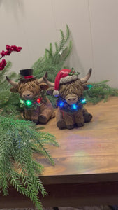 Add a touch of farmhouse whimsy to your holiday décor with this set of lighted Highland cow figurines. Each adorable cow is dressed for the season—one in a Santa hat and the other in a top hat—complete with festive greenery and glowing LED lights around their necks.