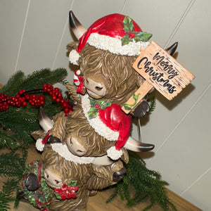 Bring a playful touch to your Christmas décor with this adorable stacked Highland cow figurine. Featuring three shaggy cows piled high, each wearing festive Santa hats and holiday scarves, this piece is full of personality and seasonal charm.