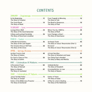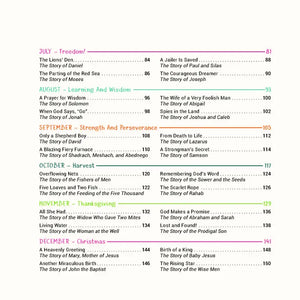 A Year of Bible Stories Is Sure to Become a Storytime Favorite in Your House! This lovely keepsake Bible storybook for kids celebrates each month of the calendar year with 48 best-loved stories from God's Word. The stories are arranged into monthly themes that relate to a specific month of the calendar year: