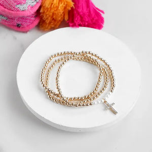 Set of three bracelets are made to fit most wrists. 0.5" Cross pendant.