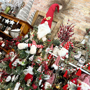 Gnome tree hugger/topper with red knit hat, holly sprig and beard! Red and white striped long arms that wrap around the tree, red boot with white fur trim and a long white bearded head topper that is a hollowed out cone that fits over the top of the tree. Such a cute addition to your Christmas tree this year!