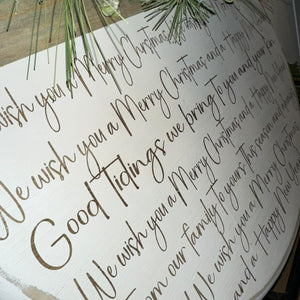 The top portion of this sign is stained, the bottom painted. The sentiment text is engraved into the wood, the family name is cute from 3mm wood and attached. We added holiday greens, berries and a festive bow to complete this cute holiday piece! *Other bow/greens options are listed separately— each is unique! This sign is made of pine -- each piece is handpainted so there WILL be variations in distressing, wood patterns, knots, dings and dents... all adding to the uniqueness of the piece. This one also includes the holiday bow and greens— I will get as close as possible to the same look as shown. You can choose to either have a jute rope hanger, or sawtooth hanger on its back. Approximate sign dimensions available: 15" Diameter x 1" Thick.