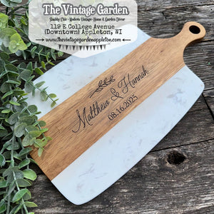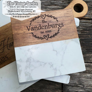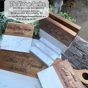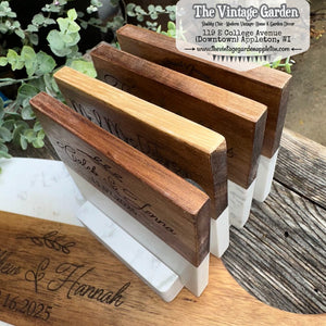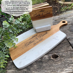 Personalized wood and marble cutting board and coasters... made to order, just for you! A cute tray to use for serving treats, to use as a centerpiece setting or to prop on an easel on your shelf. This is making a great wedding, anniversary or Christmas gift for the new couple!