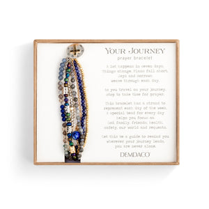 This collection features handcrafted artisan bracelets that encourage intentional living and quality time spent in prayer. It makes the perfect everyday piece, consisting of pearls, gemstones and glass beads. The journey prayer bracelet features seven unique strands representing the days of the week and prayer beads symbolizing God, family, friends, health, safety, our world and special requests. Makes a perfect gift for loved ones as an inspirational or motivational piece. An adjustable band features a unique pull out style that allows it to fit most wrists. Stunning details and artisan design set this bracelet apart.
